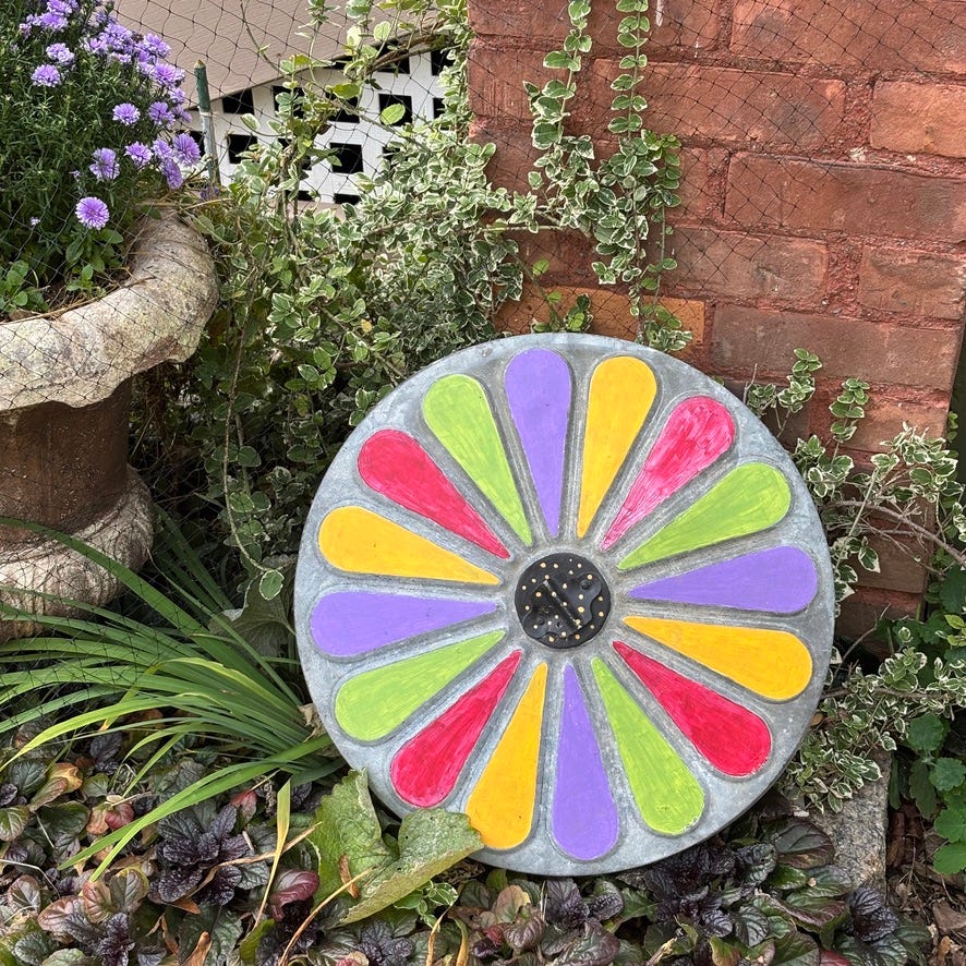 From an old garbage can lid to a whimsical piece of garden art. Nothing to lose. Only joy to be gained. My happy place.
